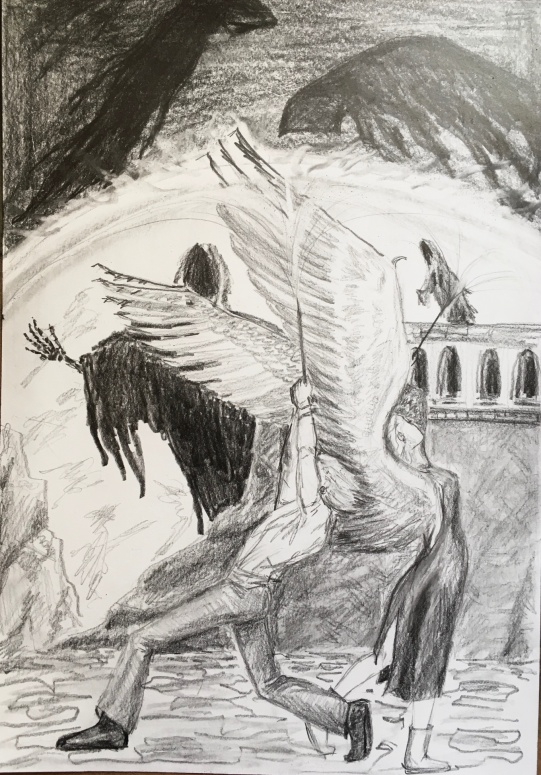 | Добрый день! Ходят слухи, что авторы любят, когда отзывы в забеге волонтера дублируют под работой)) Показать полностью Здесь несомненный плюс за идею и детальки. Билл и Флер сражаются спиной к спине против множества дементоров. Билл держит щит Патронуса, а Флер распахивает крылья вейлы, защищая и укрывая ими себя и Билла. Фигуры динамичны и выразительны, лица персонажей не видны, эмоции передаются исключительно языком тела. Карандашный набросок лаконичен и не отвлекает от главного: противопоставление семьи, тепла, близости, любви, верности с одной стороны и холодного мрака дементоров с другой. На заднем плане рисунка изображена скала, на которой виден участок стены Хогвартса. С одной стороны, я понимаю, что автору пришлось вставить эту деталь, чтобы работа точно соответствовала тематике конкурса. Но на мой взгляд, она вредит композиции и рисунку в целом. Приходится прилагать мысленное усилие, чтобы «отделить» Билла от стены, чтобы понять, что дементор сзади не прорвался за купол Билла, а все еще беспомощно тыкается за его окружностью. И еще одна проблема (на мой взгляд, разумеется). Рисунку не хватает «воздуха». Он кадрирован так жестко, что взмахни Флер крылом – она ударится о край работы. Но в целом, работа производит приятное впечатление, будоражит воображение и заставляет вспомнить за что мы так любим эту пару. Автору спасибо! 1 | |