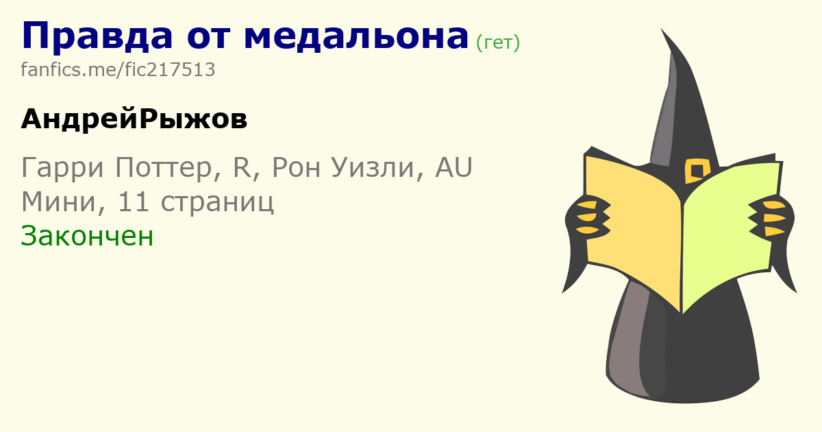 | Nalaghar Aleant_tar Фраза про метку устоявшиеся отношения была временной и рассчитана на тех, кто мог бы удивлён сменой джена на гет. Только что отправил фанфик на повторную проверку, исправив свои опечатки в именах двух ведьм. | |